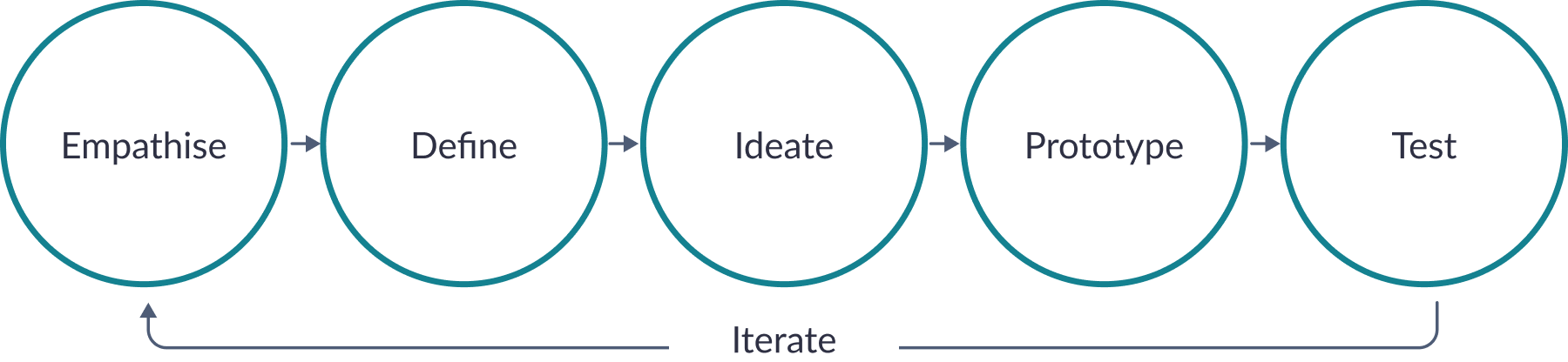 The Design Thinking Process is a human-centred approach with a focus on empathy to uncover deep insights of users and their mental models when crafting possible solutions. The steps are not linear and can occur simultaneously and can be repeated.